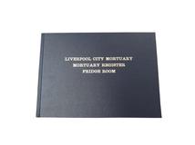 Bespoke Mortuary Register for a Local Authority. It is case bound in dark blue rexine bookcloth and has gold blocking on the front.